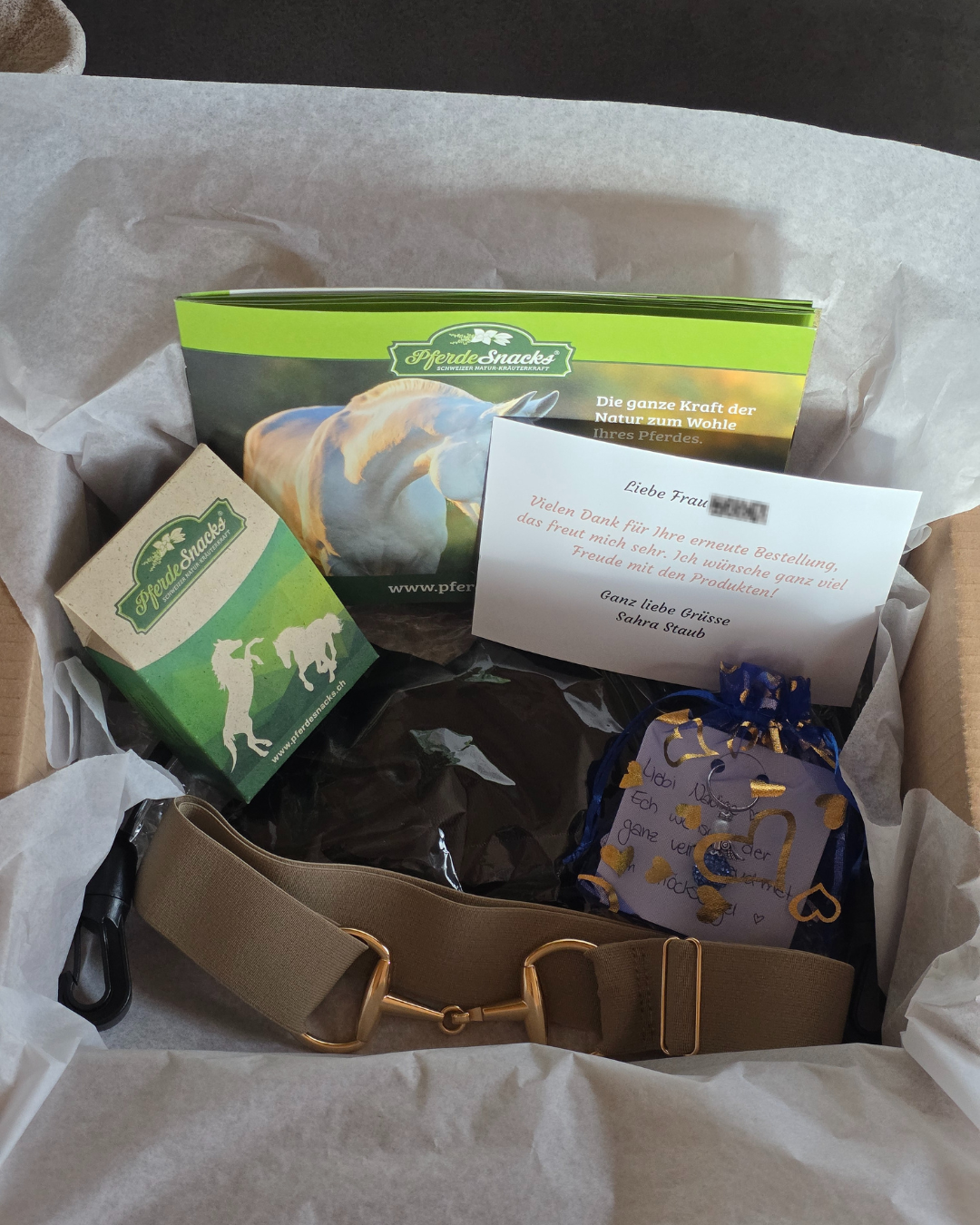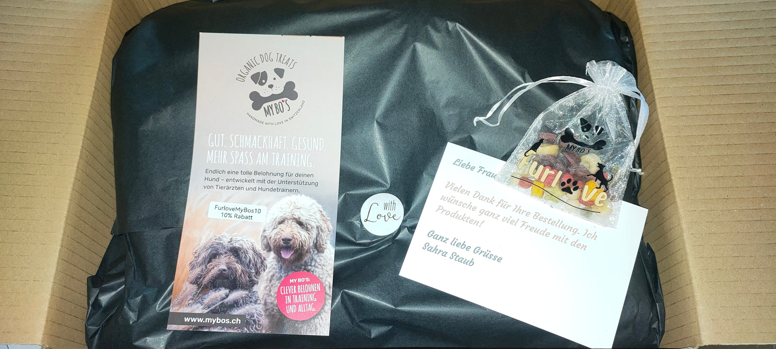 Jedes Paket wird mit viel Liebe verpackt. Zu jeder Bestellung gehört ein Leckerli-Säckli dazu. Wählen Sie zwischen den Leckerlis von My Bo's, für Hunde und Katzen - Diese Leckerli werden in der Schweiz Bio mit viel Herzblut hergestellt - Oder den natürlichen Leckerlis von Pferdesnacks. Auch diese werden mit viel Liebe in der Schweiz hergestellt.